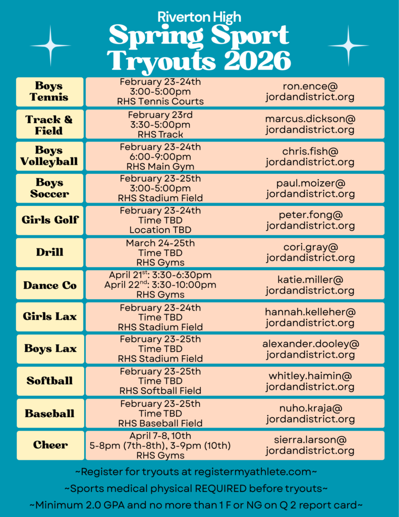 Course Requests for the next academic year are now open! Arena Scheduling Dates: During Arena Scheduling, students will be able to add/drop elective classes. and will have some flexibility to make other adjustments to their schedule. Please note that Arena Scheduling will close on May 25th. Make sure to finalize any changes by then, as class changes will be limited after this date. All boys interested in boy's volleyball, plan on attending the meeting with your parents on Friday, January 23rd. An open gym will follow the meeting from 7:30-9:30 in the gym. Click below to watch all major sporting events in the RHS stadium or gym. The games will be streamed live. Patrons will need to create a free account to view the video. Applying for College? Great information can be found on our Counseling Center website. Another good resources is the Fair Opportunity Project Guide. This is a a free resource designed to help students with college admission and financial aid. Click here to view our Non-Discrimination Policy regarding the CTE classes offered at Riverton High School.Course Requests and Arena Scheduling